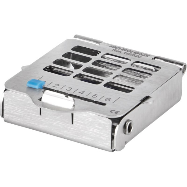 Diese ultraleichten Endo-Halter sind sehr stark, aber leicht und wurden speziell für den Einsatz in Reinigungs- und Desinfektionsgeräten sowie in Ultraschallbädern entwickelt. Im geschlossenen Zustand wird der Ultralight-Endohalter zu einer Kassette, die ein hohes Maß an Schutz für Ihre endodontischen Instrumente bietet. Elektropoliert für eine glänzende Oberfläche. Verfügbar für 4, 8 oder 12 Endo-Instrumente. Diese Halter aus Edelstahl und Silikon sind für alle Desinfektions- und Reinigungslösungen sowie für alle Sterilisationsprozesse geeignet. Der interne Halter kann gedreht werden: Wenn Sie die Kassette öffnen, drehen Sie den internen Halter vertikal, um die Instrumente zu präsentieren, was die Verwendung sehr einfach macht. Die kleinen Silikonstopfen halten Ihre Instrumente sicher. Äußerlich gibt es ein Sterimeter mit den Nummern 1 bis 10. Stück Halter blau, 12 Instrumente