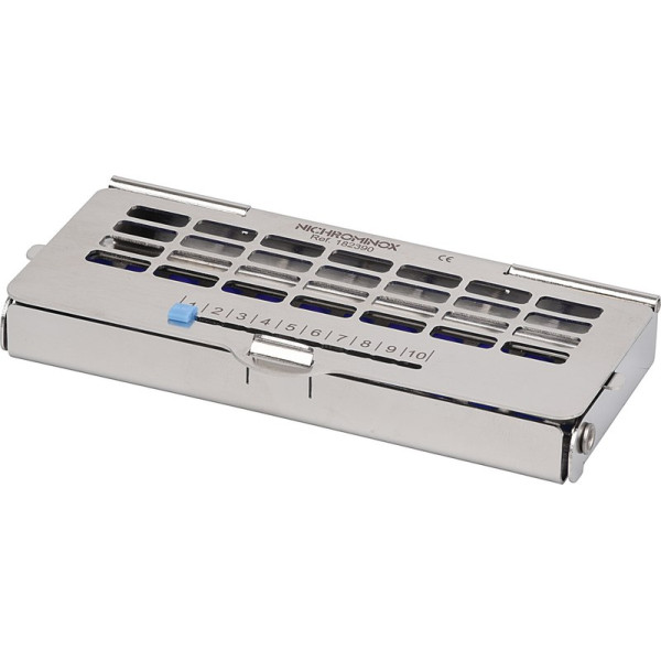 Ez ultrakönnyű Endo-tulajdonosok nagyon erős, de könnyű és kifejezetten használható mosó-fertőtlenítő és ultrahangos fürdők. Ha zárva van, az ultrakönnyű Endohalter egy kazetta, ami biztosítja a magas szintű védelmet nyújt a gyökérkezelő eszközök. Electro csiszolt egy fényes felülettel. Elérhető 4, 8 vagy 12 Endo-eszközök. Ezek a tartók, rozsdamentes acél és szilikon alkalmasak minden fertőtlenítőszerek és tisztító oldatok, valamint az összes sterilizálási folyamatok. A belső tartó elforgatható: Amikor megnyitjuk a patront, viszont a belső tartó függőlegesen, hogy bemutassa a műszerek, így a használata nagyon egyszerű. A kis szilikon dugók tartani a szerszámok biztonságos. Külsőleg van egy Sterimeter számokkal 1-10 fok.Holder kék, 12 eszközök