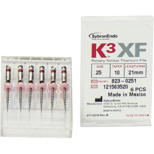K3XF bietet die Sicherheit und selbstständige Zentrierung der originalen K3 Feile und dazu eine außergewöhnliche Flexibilität und Widerstandsfähigkeit gegenüber zyklischer Ermüdung dank einer eigens entwickelten R-Phase™-Technologie. K3XF bietet das Optimum an Sicherheit, Flexibilität und Kontrolle für Benutzer von rotierenden Feilen, die sich stabilere und zugleich flexiblere Feilen wünschen. Packung 6 Feilen 21 mm, Taper.10 ISO 025