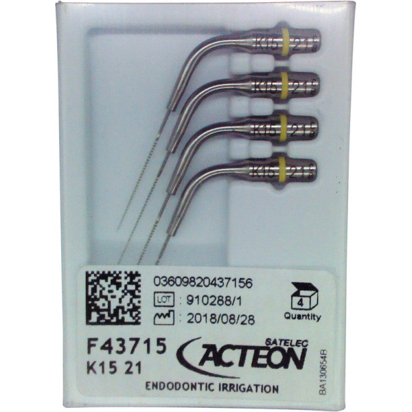 Die Sonofeilen werden mit einer Desinfektionslösung oder mit Salvizol EDTA während der einzelnen Behandlungsabschnitte bzw. mit Natriumhypochlorit zur Gewährleistung der Dekontamination und endgültigen Reinigung verwendet. Die Spülung erfolgt bis zur Beseitigung der Schmierschicht. Dabei ist höchste Sorgfalt anzuwenden.Feile K10 - Spülung zu BeginnFeile K15 - Spülung am EndeFeile K25 - Spülung am Ende in breiten KanälenFeile K30 - Spülung von breiten oder frischen Kanälen Blisterpackung 4 Feilen 21 mm K15