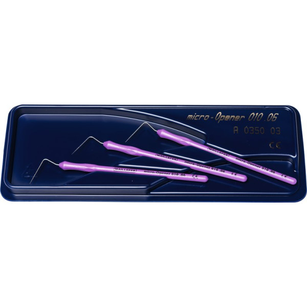 Endodontische Spezialinstrumente für optimale Sicht auf den Operationsraum. Dank des ergonomischen Handgriffs bleibt die Hand des Behandlers außerhalb des Mundes. Besonders geeignet für die Arbeit mit dem OP-Mikroskop. Micro-Opener - Spezial-Feile aus Edelstahl mit zierlichem ergonomischem Griff, erhältlich in den Konizitäten 4% oder 6%, Länge 17 mm. Für die Lokalisierung und den erleichterten Zugang zu den Wurzelkanälen. Micro-Debrider - Spezial-Hedstroemfeile aus Edelstahl mit zierlichem ergonomischem Griff, Konizität 2%, Länge 16 mm. Für die Entfernung von Gewebe, Guttapercha etc. Packung 3 Micro-Opener Taper.06 ISO 010