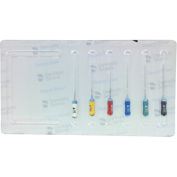 Flexo-Instrumente aus Edelstahl verfügen dank ihres dreieckigen Querschnitts über eine größere Flexibilität im Vergleich zu herkömmlichen Handinstrumenten. Die Spitze der Instrumente ist abgerundet und nicht schneidend. Bis Größe 030 auch in 18 mm lieferbar. K-Flexoreamer 21, 25 und 31 mm Ref. A 011C. Sortiment 6 Flexoreamer 25 mm ISO 015-040