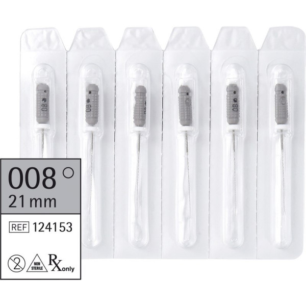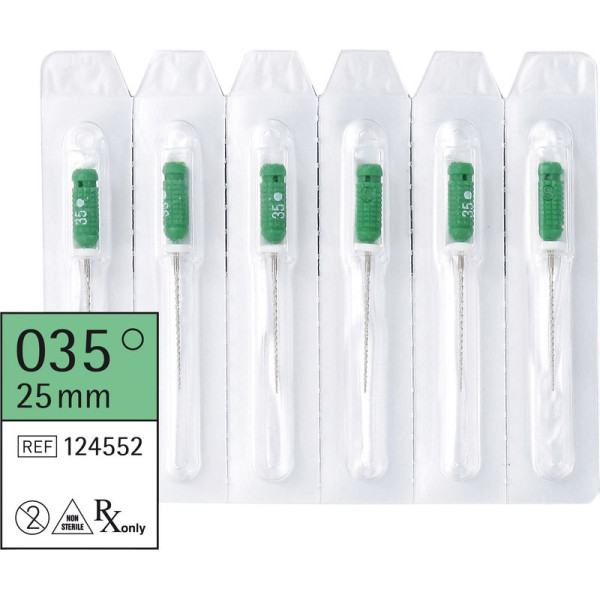Hochwertige und ISO-konform exakt hergestellte Endo-Instrumente "Made by Sendoline". Sie haben eine sehr gute Schneidleistung und eine hohe Bruchsicherheit. Die Instrumente sind farbcodiert nach ISO-Größen und sterilisierbar bis 200 °C. Der Griff ist durch die ergonomische Grippfläche rutschfest und das Instrument damit sicher zu verwenden. In einer Blisterpackung, die eine hygienische Einzelentnahme gewährleistet, befinden sich 6 Instrumente, die mit einem Silikonstopper ausgestattet sind. Es handelt sich um ein single use Produkt, dass vor dem Einsatz der Sterilisation bedarf. Packung 6 Feilen 25 mm ISO 035