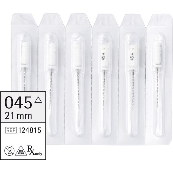Hochwertige und ISO-konform exakt hergestellte Endo-Instrumente "Made by Sendoline". Sie haben eine sehr gute Schneidleistung und eine hohe Bruchsicherheit. Die Instrumente sind farbcodiert nach ISO-Größen und sterilisierbar bis 200 °C. Der Griff ist durch die ergonomische Grippfläche rutschfest und das Instrument damit sicher zu verwenden. In einer Blisterpackung, die eine hygienische Einzelentnahme gewährleistet, befinden sich 6 Instrumente, die mit einem Silikonstopper ausgestattet sind. Es handelt sich um ein single use Produkt, dass vor dem Einsatz der Sterilisation bedarf. Packung 6 Bohrer 21 mm ISO 045