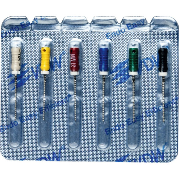 Für alle Aufbereitungstechniken in drehend feilender Bewegung.EdelstahlISO 006-25 Vierkant-Querschnitt für höhere BruchsicherheitISO 030-140 Dreikant-Querschnitt für höhere SchneidleistungDeutliche Kennzeichnung des Instrumententyps und ISO Größe am GriffRöntgenopake KalibrierringeBruchsichere, hochflexible Stahllegierung mit hoher GefügereinheitDie inaktive Spitze führt das Instrument sicher im KanalMit vormontierten Silikon-Stoppern Sortiment 6 Feilen 21 mm ISO 045-080