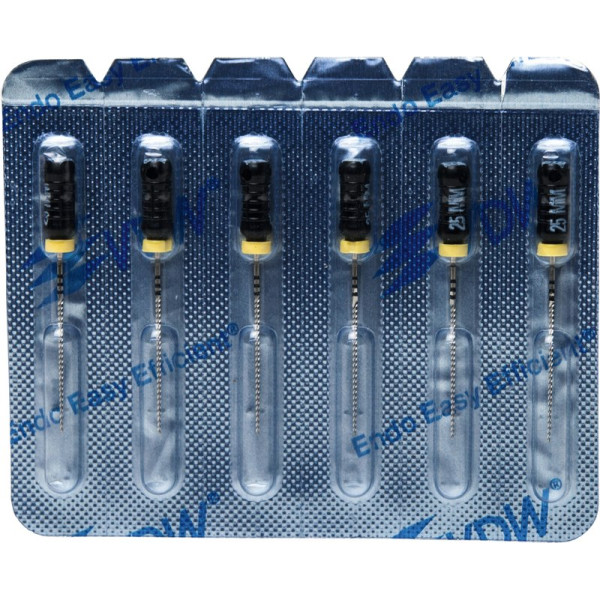 Für alle Aufbereitungstechniken in drehend feilender Bewegung.EdelstahlISO 006-25 Vierkant-Querschnitt für höhere BruchsicherheitISO 030-140 Dreikant-Querschnitt für höhere SchneidleistungDeutliche Kennzeichnung des Instrumententyps und ISO Größe am GriffRöntgenopake KalibrierringeBruchsichere, hochflexible Stahllegierung mit hoher GefügereinheitDie inaktive Spitze führt das Instrument sicher im KanalMit vormontierten Silikon-Stoppern Blisterpackung 6 Feilen 25 mm ISO 040