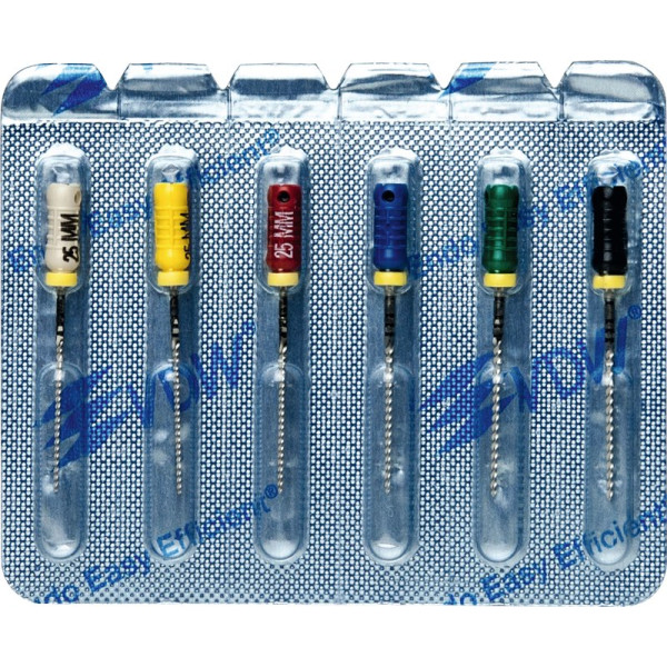 Für alle Aufbereitungstechniken in drehend feilender Bewegung.EdelstahlISO 006-25 Vierkant-Querschnitt für höhere BruchsicherheitISO 030-140 Dreikant-Querschnitt für höhere SchneidleistungDeutliche Kennzeichnung des Instrumententyps und ISO Größe am GriffRöntgenopake KalibrierringeBruchsichere, hochflexible Stahllegierung mit hoher GefügereinheitDie inaktive Spitze führt das Instrument sicher im KanalMit vormontierten Silikon-Stoppern Sortiment 6 Feilen 25 mm ISO 045-080