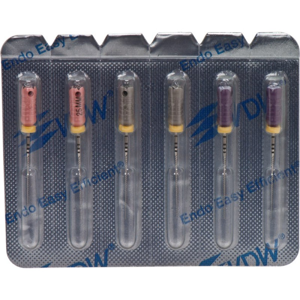 Für alle Aufbereitungstechniken in drehend feilender Bewegung.EdelstahlISO 006-25 Vierkant-Querschnitt für höhere BruchsicherheitISO 030-140 Dreikant-Querschnitt für höhere SchneidleistungDeutliche Kennzeichnung des Instrumententyps und ISO Größe am GriffRöntgenopake KalibrierringeBruchsichere, hochflexible Stahllegierung mit hoher GefügereinheitDie inaktive Spitze führt das Instrument sicher im KanalMit vormontierten Silikon-Stoppern Sortiment 6 Feilen 25 mm ISO 006-010