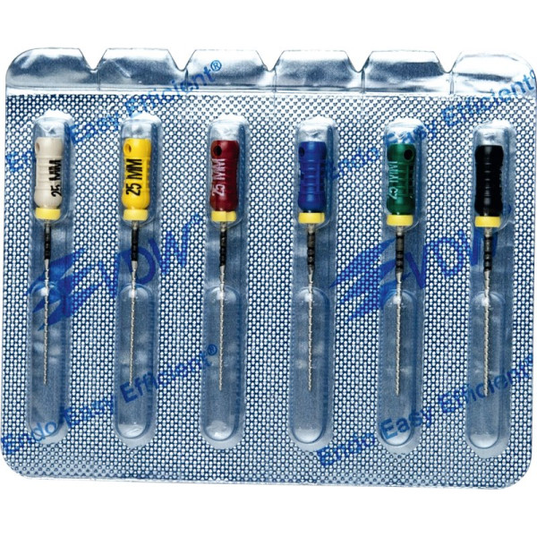 Hocheffiziente Aufbereitung in feilender Zugbewegung.Hohe SchneidleistungBruchsichere, hochflexible Stahllegierung mit hoher GefügereinheitDie inaktive Spitze führt das Instrument sicher im KanalDeutliche Kennzeichnung des Instrumententyps und der ISO Größe am GriffRöntgenopake KalibrierringeZusätzlicher Längenaufdruck am GriffMit vormontierten Silikon-Stoppern Sortiment 6 Feilen 25 mm ISO 045-080