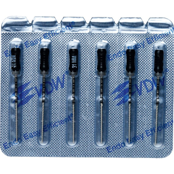 Hocheffiziente Aufbereitung in feilender Zugbewegung.Hohe SchneidleistungBruchsichere, hochflexible Stahllegierung mit hoher GefügereinheitDie inaktive Spitze führt das Instrument sicher im KanalDeutliche Kennzeichnung des Instrumententyps und der ISO Größe am GriffRöntgenopake KalibrierringeZusätzlicher Längenaufdruck am GriffMit vormontierten Silikon-Stoppern Blisterpackung 6 Feilen 31 mm ISO 080