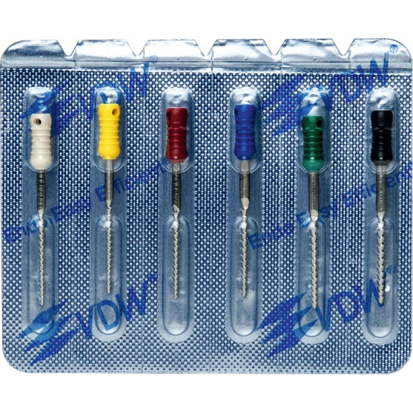 Hocheffiziente Aufbereitung in feilender Zugbewegung.Hohe SchneidleistungBruchsichere, hochflexible Stahllegierung mit hoher GefügereinheitDie inaktive Spitze führt das Instrument sicher im KanalDeutliche Kennzeichnung des Instrumententyps und der ISO Größe am GriffRöntgenopake KalibrierringeZusätzlicher Längenaufdruck am GriffMit vormontierten Silikon-Stoppern Sortiment 6 Feilen 25 mm ISO 090-140