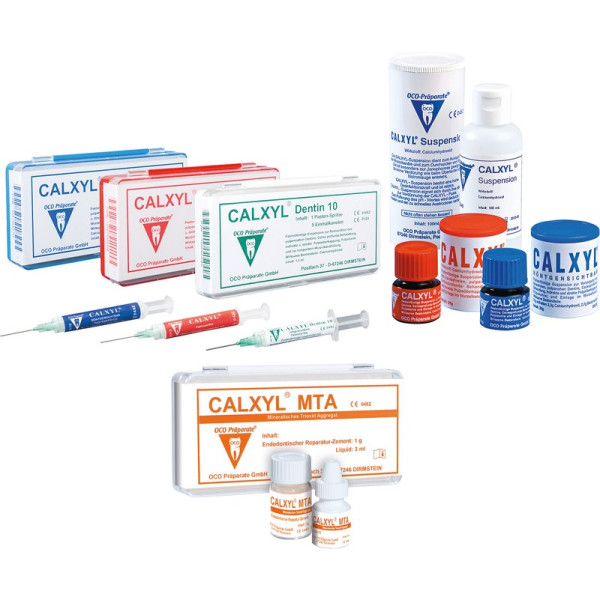 CALXYL® blau. Röntgensichtbar: gebrauchsfertige Calciumhydroxidpaste mit einem pH-Wert > 12,6 zur temporären Wurzelfüllung, indirekten und direkten Pulpenüberkappung. CALXYL® rot. Nicht röntgensichtbar: gebrauchsfertige Calciumhydroxidpaste mit einem pH-Wert > 12,6 zur temporären Wurzelfüllung, indirekten und direkten Pulpenüberkappung. CALXYL® Suspension zur Desinfektion von Wurzelkanälen und zur äquimolaren Verdünnung von Calxyl mit einem pH-Wert > 12,6. CALXYL® Dentin 10. Röntgensichtbar: Gebrauchsfertige Pastenspritze mit einem dentinähnlichen Calciumkomplex und einem pH-Wert > 12,6 zur temporären Wurzelfüllung, indirekten und direkten Pulpenüberkappung, Remineralisation. Packung 3 ml Flüssigkeit, 1 g Pulver