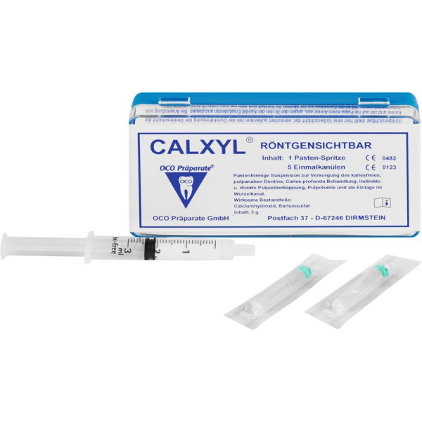 CALXYL® blau. Röntgensichtbar: gebrauchsfertige Calciumhydroxidpaste mit einem pH-Wert > 12,6 zur temporären Wurzelfüllung, indirekten und direkten Pulpenüberkappung. CALXYL® rot. Nicht röntgensichtbar: gebrauchsfertige Calciumhydroxidpaste mit einem pH-Wert > 12,6 zur temporären Wurzelfüllung, indirekten und direkten Pulpenüberkappung. CALXYL® Suspension zur Desinfektion von Wurzelkanälen und zur äquimolaren Verdünnung von Calxyl mit einem pH-Wert > 12,6. CALXYL® Dentin 10. Röntgensichtbar: Gebrauchsfertige Pastenspritze mit einem dentinähnlichen Calciumkomplex und einem pH-Wert > 12,6 zur temporären Wurzelfüllung, indirekten und direkten Pulpenüberkappung, Remineralisation. Packung 3 g Spritze blau
