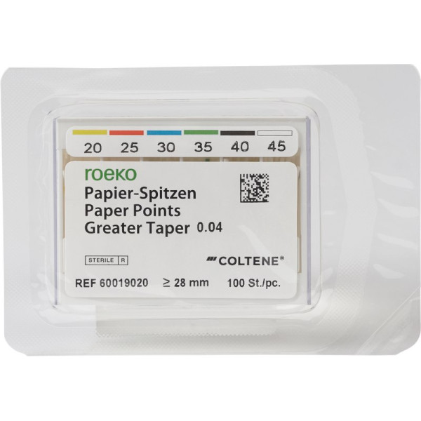 Die neuen ROEKO Papierspitzen Greater Taper.04 und .06 ergänzen unser Endoportfolio perfekt und sind ideal für Zahnärzte, die mit HyFlex CM Feilen und ROEKO Guttapercha-Spitzen Greater Taper arbeiten.SterilSaugstarkFrei von BindemittelnLänge ≥ 28 mmAls Sortierung und EinzelgrößenFest und doch flexibel zur einfachen ApplikationTop color-Kodierung (weiße Spitze, im oberen Teil farbkodiert), verhindert die Verwechslung von verschiedenen Größen Packung 100 Papierspitzen Taper.04 ISO 020-045