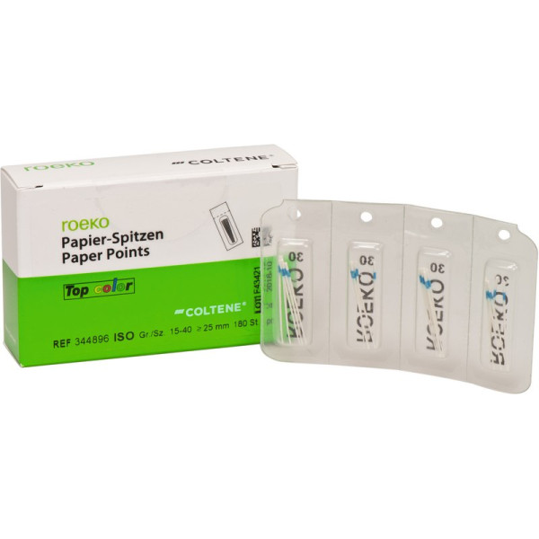 Roeko Papierspitzen werden aus extrem saugstarkem Papier ohne chemische Zusätze und Bindemittel hergestellt. Sie verbinden optimale Festigkeit mit hoher, gleichbleibender Flexibilität und absoluter Maßhaltigkeit. Zur optimalen Trocknung des Wurzelkanals nach exakter Vorbereitung mit genormten ISO-Wurzelkanalinstrumenten. Die Farbcodierung der Roeko Papierspitzen color verhindert die Verwechslung verschiedener Größen. Beim Kontakt mit Feuchtigkeit erscheint die Farbe der Papierspitze intensiver – eine optimale Kontrolle auf Restfeuchtigkeit im Kanal. Natriumhypochlorit oder Wasserstoffperoxid bleichen die Spitze dagegen aus. Roeko Papierspitzen Top Color verbinden die Vorteile der weißen und der ganz eingefärbten Spitzen (color). Die Teilfärbung verhindert die Verwechslung von verschiedenen Größen. Die weiße Spitze erleichtert die Kontrolle der Wurzelkanalreinigung. Für eine wirtschaftliche, sichere und zeitsparende Behandlung.SterilAbsolut maßhaltig nach ISO-NormAus extrem saugstarkem PapierFrei von BindemittelnHohe gleichbleibende Flexibilität bei optimaler FestigkeitVollautomatische HerstellungLänge: ≥ 25 mm Packung 180 Papierspitzen 015-040