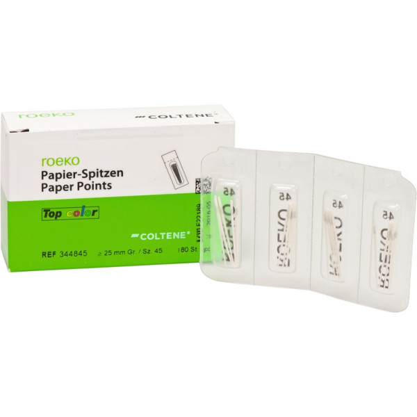 Roeko Papierspitzen werden aus extrem saugstarkem Papier ohne chemische Zusätze und Bindemittel hergestellt. Sie verbinden optimale Festigkeit mit hoher, gleichbleibender Flexibilität und absoluter Maßhaltigkeit. Zur optimalen Trocknung des Wurzelkanals nach exakter Vorbereitung mit genormten ISO-Wurzelkanalinstrumenten. Die Farbcodierung der Roeko Papierspitzen color verhindert die Verwechslung verschiedener Größen. Beim Kontakt mit Feuchtigkeit erscheint die Farbe der Papierspitze intensiver – eine optimale Kontrolle auf Restfeuchtigkeit im Kanal. Natriumhypochlorit oder Wasserstoffperoxid bleichen die Spitze dagegen aus. Roeko Papierspitzen Top Color verbinden die Vorteile der weißen und der ganz eingefärbten Spitzen (color). Die Teilfärbung verhindert die Verwechslung von verschiedenen Größen. Die weiße Spitze erleichtert die Kontrolle der Wurzelkanalreinigung. Für eine wirtschaftliche, sichere und zeitsparende Behandlung.SterilAbsolut maßhaltig nach ISO-NormAus extrem saugstarkem PapierFrei von BindemittelnHohe gleichbleibende Flexibilität bei optimaler FestigkeitVollautomatische HerstellungLänge: ≥ 25 mm Packung 300 Papierspitzen ISO 070