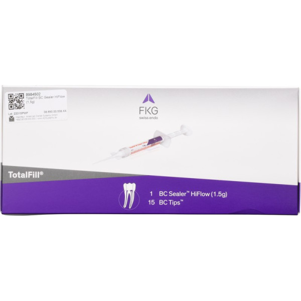 Der hoch radiopake und hydrophile TotalFill® BC Sealer HiFlow™ bildet beim Aushärten Hydroxylapatit und geht eine chemische Bindung mit dem Dentin und den biokeramisch imprägnierten Pointa (TotalFill® BC Points) ein. Im Vergleich zum TotalFill® BC Sealer™ weist der TotalFill® BC Sealer HiFlow™ beim Erwärmen eine geringere Viskosität auf und ist röntgenopaker. Dank dieser Eiegnschaften eignet er sich optimal für warme Obturationstechniken. Zudem zeichnet sich der TotalFill® BC Sealer HiFlow™ durch eine sehr hohe Haftkraft. und eine sehr hohe Biokompatibilität aus und ist hoch antibakteriell (+12 pH). Packung 1,5 g Sealer