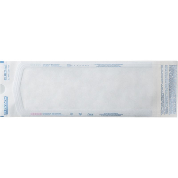 Medizinisches Papier mit erhöhter Grammatur (60 g/m²). Zusätzlich zu der dreifachen Verschweißung sind die Beutel an einem Ende mit einer vierten Sicherheitsverschweißung versehen. Einfache Bestückung der Beutel durch Ausschnitt an der Öffnungsseite. Präziser Kontrastanzeiger für Dampf und Gas. Karton 200 Beutel 90 x 250 mm