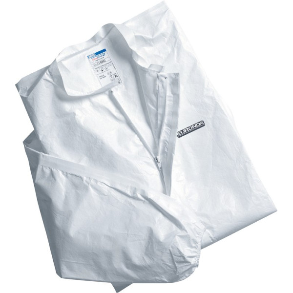 Weißer Schutzkittel mit Reißverschluss, Stehkragen und elastischen Bündchen. Einwegkittel für die Arbeit mit flüssigen und spritzenden chemischen oder infektiösen Substanzen. Zum Beispiel bei der Aufbereitung von Instrumenten beim Zahnarzt, in Krankenhäusern, Laboren, bei Podologen oder in Körperschmuck-Studios. Stück Kittel L