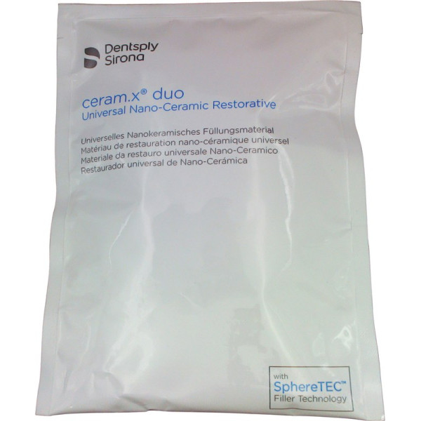 ceram.x® universal duo - jetzt mit der neuartigen SphereTEC™ Füller-Technologie! Das nanokeramische Universalkomposit wurde für hochästhetische direkte und indirekte Füllungen in der natürlichen Schichttechnik optimiert. Nur 3 Schmelz- und 4 Dentinfarben decken das gesamte VITA® Farbspektrum ab. Das einfache Schichtrezept sorgt für natürlich wirkende klinische Ergebnisse. Die neue SphereTEC™ Füller-Technologie enthält kugelförmige, granulierte Füller in Kombination mit einer optimierten Harzmatrix. Dies führt zu herausragendem Verarbeitungskomfort bei hoher Ästhetik! Exzellente Adaptation und Modellierbarkeit Einfaches Zwei-Transluzenzen-System: 3 Schmelz- und 4 Dentinfarben für das VITA® System Schnelle und einfache Politur für außerordentlichen Glanz Natürliche Ästhetik Nachfüllpackung 16 x 0,25 g Compule D1