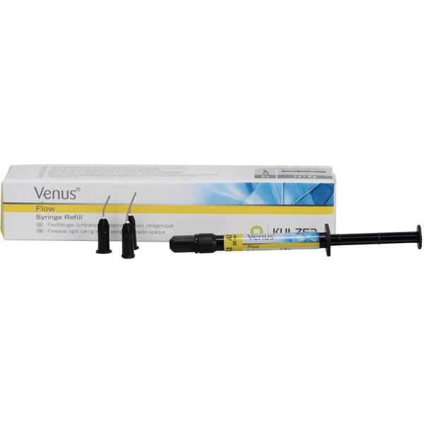 Venus® flow ist ein fließfähiges, lichthärtendes, röntgenopakes Mikro-Hybridcomposite für die adhäsive, zahnfarbene Front- und Seitenzahnrestauration. Aufgrund seiner niedrigen Viskosität benetzt Venus® flow die Zahnhartsubstanz ausgezeichnet. IndikationenFissurenversiegelungenErweiterte FissurenversiegelungenFüllungen der Klasse VMinimalinvasive Füllungen der Klassen I und II im nicht kautragenden BereichMinivalinvasive Füllungen der Klasse IIIKleinere Form- und Farbkorrekturen an Schmelz und DentinSchienung von ZähnenKavitätenlining (die weiß-opake Einfärbung des Baseliners kann zur optischen Kontrolle des Überganges Composite/ Zahnhartsubstanz sowie zur effizienten Abdeckung von Zahnverfärbungen und nekrotisiertem Dentin eingesetzt werden)Bracketbefestigungen Packung 1,8 g Spritze A3, 5 Kanülen