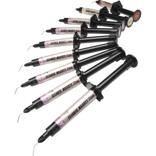 CLEARFIL MAJESTY™ Flow ist ein dünnfließendes, gleichzeitig jedoch hochgefülltes, lichthärtendes, radioopakes Hybridkomposit mit einem Fülleranteil von 81 Gew. %. Dank einer neuen Oberflächenbeschichtung der Füllkörper gelingt es Kuraray gute Fließfähigkeit und hohen Füllstoffanteil zu vereinen und ein gut anfließendes Komposit mit physikalischen Eigenschaften eines Hybridkomposits herzustellen. (Druckfestigkeit von 329 MPa, Biegefestigkeit von 145 MPa, niedrige Polymerisationsschrumpfung von 1,9%). Dank der innovativen Applikationsspritze lässt sich das thixotrophe Verhalten des Komposits perfekt und präzise steuern. Nach der blasenfreien Applikation verbleibt CLEARFIL MAJESTY™ Flowpunktgenau an der aufgetragenen Stelle ohne an der Applikationsspitze zu kleben oder Fäden zu ziehen. Packung 3,2 g Spritze A1, 15 Applikationsspitzen