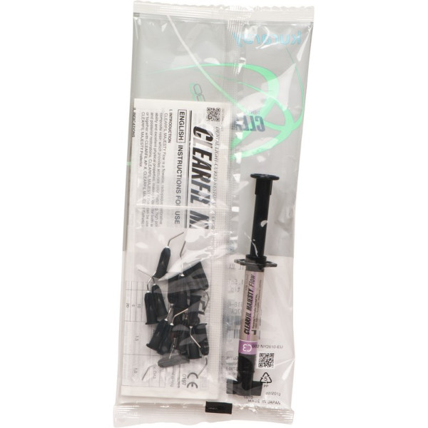 CLEARFIL MAJESTY™ Flow ist ein dünnfließendes, gleichzeitig jedoch hochgefülltes, lichthärtendes, radioopakes Hybridkomposit mit einem Fülleranteil von 81 Gew. %. Dank einer neuen Oberflächenbeschichtung der Füllkörper gelingt es Kuraray gute Fließfähigkeit und hohen Füllstoffanteil zu vereinen und ein gut anfließendes Komposit mit physikalischen Eigenschaften eines Hybridkomposits herzustellen. (Druckfestigkeit von 329 MPa, Biegefestigkeit von 145 MPa, niedrige Polymerisationsschrumpfung von 1,9%). Dank der innovativen Applikationsspritze lässt sich das thixotrophe Verhalten des Komposits perfekt und präzise steuern. Nach der blasenfreien Applikation verbleibt CLEARFIL MAJESTY™ Flowpunktgenau an der aufgetragenen Stelle ohne an der Applikationsspitze zu kleben oder Fäden zu ziehen. Packung 3,2 g Spritze C3, 15 Applikationsspitzen