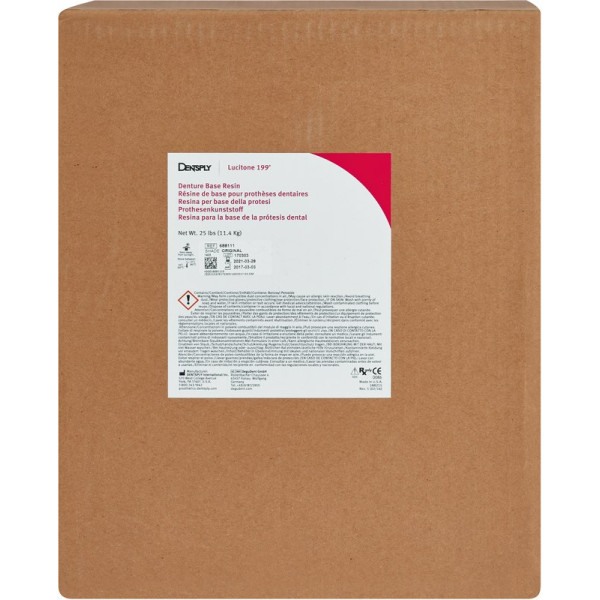 Lucitone 199® ist ein nachweislich kostengünstiges Prothesenmaterial, das Wirtschaftlichkeit mit hervorragenden Materialeigenschaften kombiniert, um vielseitig rentabel zu sein. Die Bruchfestigkeit von Lucitone 199® übersteigt die aller getesteten Prothesenmaterialien. Außerdem ermöglicht die höhere Biegefestigkeit die Herstellung von nahezu unzerbrechlichen Prothesen. Diese bemerkenswerte Eigenschaft basiert auf Kautschuk-Molekülen, die in die Acrylat-Struktur eingebaut wurden und so einen“ Stoßdämpfer-Effekt“ erzeugen. Das feine Pulver ermöglicht eine dichte, kompakte Mischung, die Porositäten oder Bisserhöhungen vermeidet. Lucitone 199® kann zur Herstellung von Voll- oder Teil-Prothesen, Unterfütterungen, Reparaturen und Aufbiss-Schienen verwendet werden. Vorteile: Exzellente Ästhetik Ausgewogene Transparenz 5 Jahre Garantie Hohe Schlagzägigkeit Leicht polierbar Patentierte Rezeptur Konventionelle Verarbeitung oder in der Injektionstechnik (Success System) anwendbar Packung 11340 g Pulver, 540 Einheiten