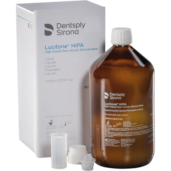 Hochleistungs- Prothesenkunststoff. Lucitone® HIPA ist das erste Hochleistungs-Kaltpolymerisat. Es übertrifft die Standards für Werkstoffe mit erhöhter Schlagzähigkeit, wie es bisher nur bei Heißpolymerisaten bekannt war. Lucitone® HIPA wurde für die Herstellung von Voll- und Teilprothesen inklusive Implantat gestützter Deckprothesen, Reparaturen, Unterfütterungen sowie anderer dentaler Anwendungen entwickelt. Es ist in verschiedenen Farben, mit und ohne Adern erhältlich. Flasche 1 Liter