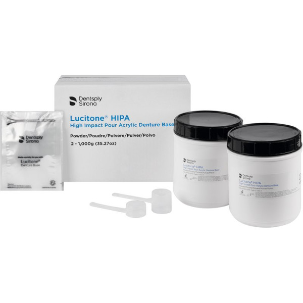 Hochleistungs- Prothesenkunststoff. Lucitone® HIPA ist das erste Hochleistungs-Kaltpolymerisat. Es übertrifft die Standards für Werkstoffe mit erhöhter Schlagzähigkeit, wie es bisher nur bei Heißpolymerisaten bekannt war. Lucitone® HIPA wurde für die Herstellung von Voll- und Teilprothesen inklusive Implantat gestützter Deckprothesen, Reparaturen, Unterfütterungen sowie anderer dentaler Anwendungen entwickelt. Es ist in verschiedenen Farben, mit und ohne Adern erhältlich. Packung 2 kg Pulver opaque geadert