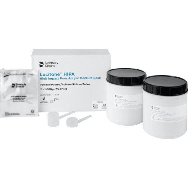 Hochleistungs- Prothesenkunststoff. Lucitone® HIPA ist das erste Hochleistungs-Kaltpolymerisat. Es übertrifft die Standards für Werkstoffe mit erhöhter Schlagzähigkeit, wie es bisher nur bei Heißpolymerisaten bekannt war. Lucitone® HIPA wurde für die Herstellung von Voll- und Teilprothesen inklusive Implantat gestützter Deckprothesen, Reparaturen, Unterfütterungen sowie anderer dentaler Anwendungen entwickelt. Es ist in verschiedenen Farben, mit und ohne Adern erhältlich. Packung 2 kg Pulver pink natur geadert