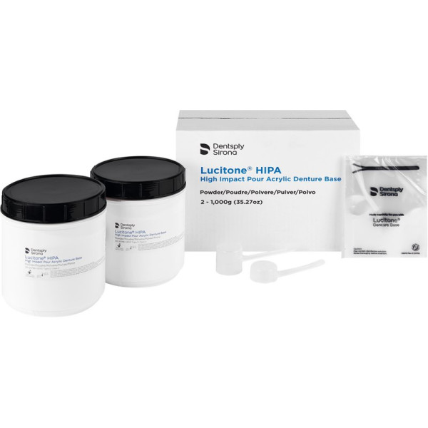 Hochleistungs- Prothesenkunststoff. Lucitone® HIPA ist das erste Hochleistungs-Kaltpolymerisat. Es übertrifft die Standards für Werkstoffe mit erhöhter Schlagzähigkeit, wie es bisher nur bei Heißpolymerisaten bekannt war. Lucitone® HIPA wurde für die Herstellung von Voll- und Teilprothesen inklusive Implantat gestützter Deckprothesen, Reparaturen, Unterfütterungen sowie anderer dentaler Anwendungen entwickelt. Es ist in verschiedenen Farben, mit und ohne Adern erhältlich. Packung 2 kg Pulver pink opaque