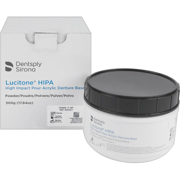 Hochleistungs- Prothesenkunststoff. Lucitone® HIPA ist das erste Hochleistungs-Kaltpolymerisat. Es übertrifft die Standards für Werkstoffe mit erhöhter Schlagzähigkeit, wie es bisher nur bei Heißpolymerisaten bekannt war. Lucitone® HIPA wurde für die Herstellung von Voll- und Teilprothesen inklusive Implantat gestützter Deckprothesen, Reparaturen, Unterfütterungen sowie anderer dentaler Anwendungen entwickelt. Es ist in verschiedenen Farben, mit und ohne Adern erhältlich. Packung 500 g Pulver pink intense