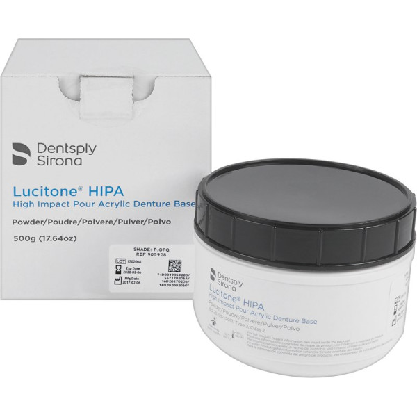 Hochleistungs- Prothesenkunststoff. Lucitone® HIPA ist das erste Hochleistungs-Kaltpolymerisat. Es übertrifft die Standards für Werkstoffe mit erhöhter Schlagzähigkeit, wie es bisher nur bei Heißpolymerisaten bekannt war. Lucitone® HIPA wurde für die Herstellung von Voll- und Teilprothesen inklusive Implantat gestützter Deckprothesen, Reparaturen, Unterfütterungen sowie anderer dentaler Anwendungen entwickelt. Es ist in verschiedenen Farben, mit und ohne Adern erhältlich. Packung 500 g Pulver pink opaque