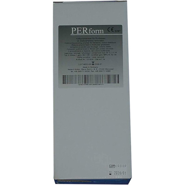 Kunststoff-Warmpolymerisat für Prothesen im Perform-Inkovac-Polymerisationssystem und in der Modellgusstechnik. Perform Kunststoff ist speziell für die Gießtechnik entwickelt worden und zeichnet sich durch besonders gute Fließeigenschaften aus. Es ist ein farbstabiles Polymethymetacrylat mit Barbitursäure-Katalysatorsystem. Restmonomer unter 1%. Flasche 1 Liter Flüssigkeit