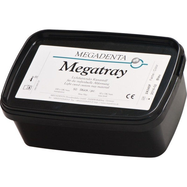 Lichthärtender Kunststoff zur Herstellung individueller Abformlöffel und Basisplatten. MEGATRAY ist ein lichthärtendes Einkomponenten-Composite und besteht aus einer Matrix von mehr funktionellen Methacrylaten und anorganischen Füllstoffen. MEGATRAY zeichnet sich aus durchGeringe SchrumpfungGeringe WasseraufnahmeHohe FormstabilitatZur Herstellung von individuellen Abformlöffeln, Basisplatten für Bißschablonen und Platten für intraorale Stützstiftregistrierung Packung 50 Platten OK, blau