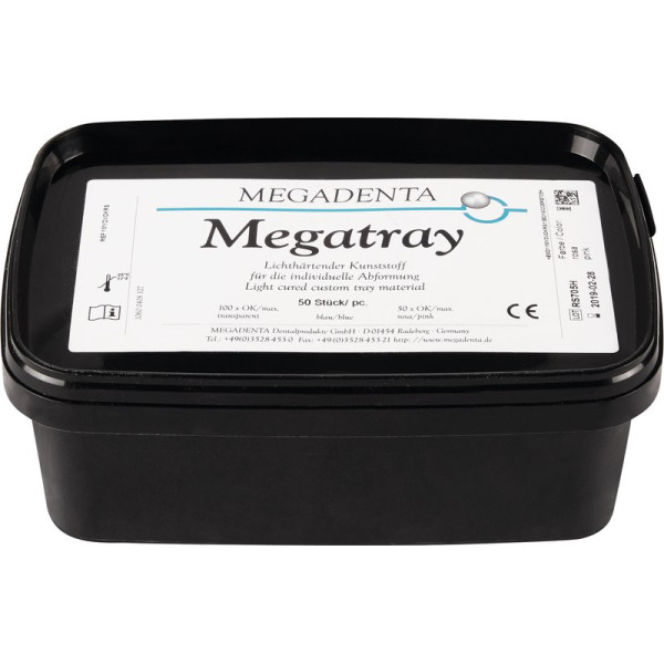Lichthärtender Kunststoff zur Herstellung individueller Abformlöffel und Basisplatten. MEGATRAY ist ein lichthärtendes Einkomponenten-Composite und besteht aus einer Matrix von mehr funktionellen Methacrylaten und anorganischen Füllstoffen. MEGATRAY zeichnet sich aus durchGeringe SchrumpfungGeringe WasseraufnahmeHohe FormstabilitatZur Herstellung von individuellen Abformlöffeln, Basisplatten für Bißschablonen und Platten für intraorale Stützstiftregistrierung Packung 50 Platten OK, rosa