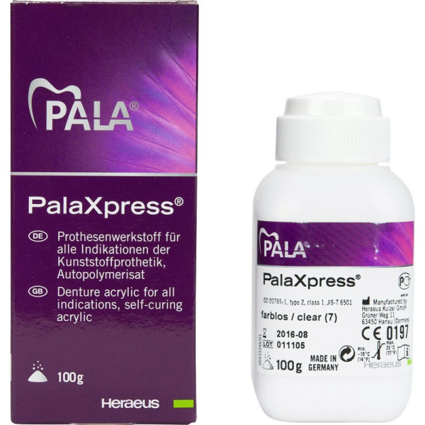 Passgenauer Universal-Prothesenkunststoff. Der Werkstoff für die moderne Qualitätsprothetik. PalaXpress® ist der Kunststoff für viele Indikationen in der Kunststoff-Prothetik! Durch die einzigartige Rezeptur bietet Ihnen PalaXpress® sowohl bei der Gießtechnik als auch bei der Injektionstechnik eine ungewöhnlich große Verarbeitungsbreite. VerarbeitungGießverfahrenInjektionsverfahren mit Palajet VorteileHöchste PassgenauigkeitKomplettierung der gegenüberliegenden Sättel, ohne ZwischenpolymerisationSehr gute Schleimhautverträglichkeit durch geringen Restmonomergehalt Packung 100 g Pulver farblos