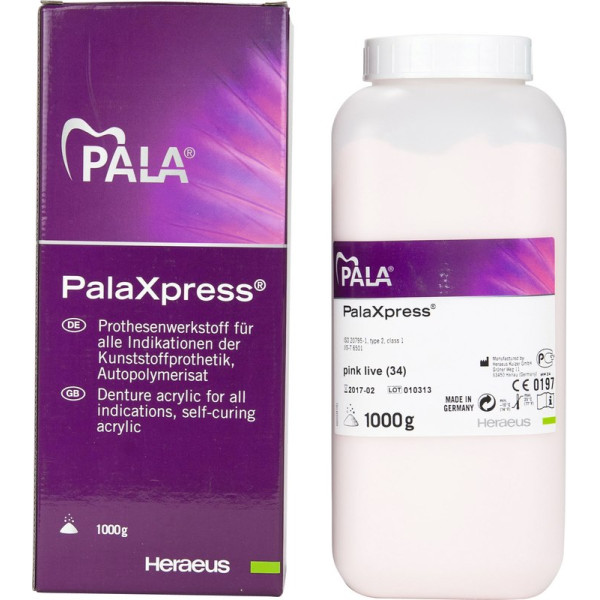 Passgenauer Universal-Prothesenkunststoff. Der Werkstoff für die moderne Qualitätsprothetik. PalaXpress® ist der Kunststoff für viele Indikationen in der Kunststoff-Prothetik! Durch die einzigartige Rezeptur bietet Ihnen PalaXpress® sowohl bei der Gießtechnik als auch bei der Injektionstechnik eine ungewöhnlich große Verarbeitungsbreite. VerarbeitungGießverfahrenInjektionsverfahren mit Palajet VorteileHöchste PassgenauigkeitKomplettierung der gegenüberliegenden Sättel, ohne ZwischenpolymerisationSehr gute Schleimhautverträglichkeit durch geringen Restmonomergehalt Packung 1 kg Pulver pink live