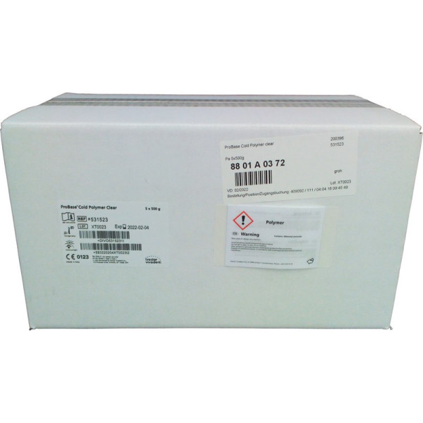 Das kalthärtende ProBase® Cold zeichnet sich besonders durch hervorragende Fließ- und Modelliereigenschaften aus. Es lässt sich in der Gieß- und Stopftechnik anwenden und ermöglicht durch die hervorragenden Materialeigenschaften stabile Prothesenkörper. Entspricht ISO EN 1567. IndikationReparaturenTeil- und KombinationsprothetikUnterfütterungenTotalprothesen VorteileBequem anwendbarForm- und Farbstabil Weitere FarbenPink-V, geadertPink-V-ImplantSUS-L, geadertUS-PClear Packung 5 x 500 g Pulver clear