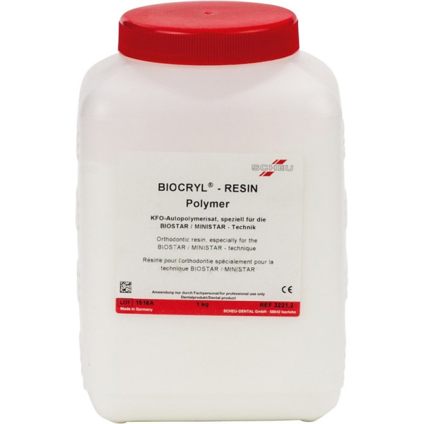 Spezielles KFO-Autopolymerisat zum Einpolymerisieren und Unterfüttern von Klammerenden und Dehnschrauben bei der Herstellung von Retentions- und Dehnplatten aus BIOCRYL® C und BIOCRYL® M in der Druckformtechnik. Die Polymerisation erfolgt während der Abkühlphase im Druckformgerät. Die zeitaufwendige, konventionelle Methode der Drucktopf-Polymerisation entfällt. Packung 1 kg Polymer