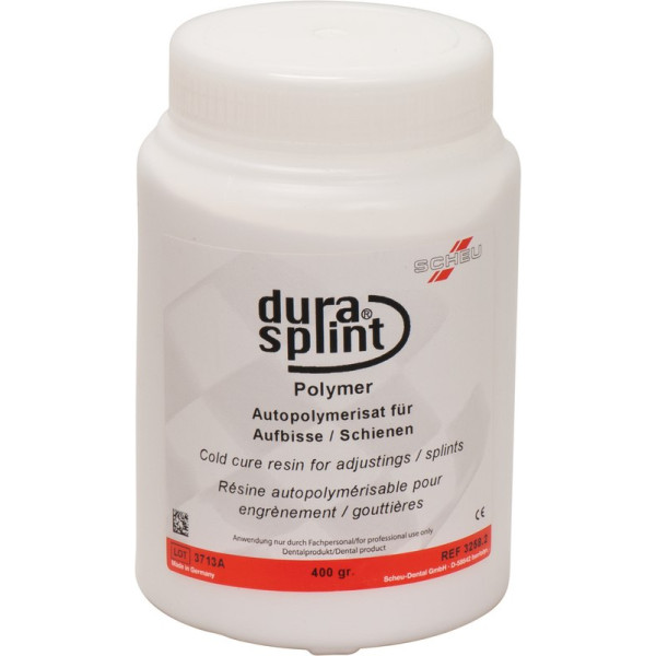DURASPLINT® ist ein hochtransparentes Autopolymerisat, das speziell für den Aufbau adjustierter Oberflächen von funktionstherapeutischen Aufbiss-Schienen entwickelt wurde. DURASPLINT® erfüllt die Ansprüche, die der Behandler, Techniker und Patient an ein adjustiertes Schienengerät stellt, insbesondere in Hinsicht auf die Passgenauigkeit, problemgerechte funktionelle Herstellung und Gestaltung sowie ansprechendes Aussehen und exzellente Trageeigenschaften. Als Basis dienen tiefgezogene Schienen, mit denen DURASPLINT® einen optimalen Verbund eingeht. Packung 400 g Polymer