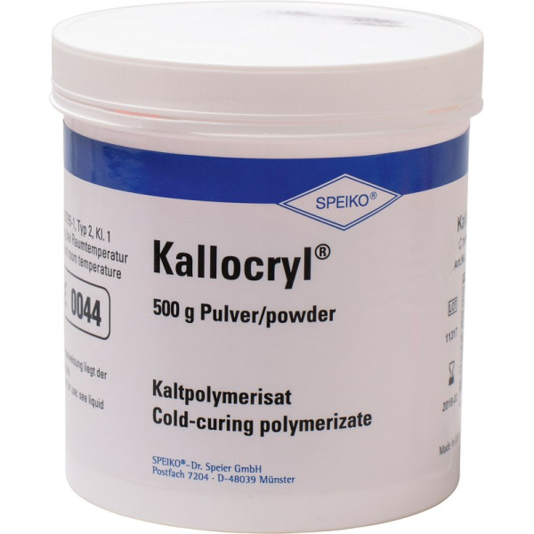 Kalthärtender Kunststoff auf Basis von MethacrylatenZusatz von Splitterpolymerisat ergibt bruchfeste ProthesenStandfester, nicht fließfähiger Kunststoff, damit besonders geeignet für Stopf- und Presstechnik sowie für ReparaturenGute mechanische und physiologische EigenschaftenFarbbeständig durch Zusatz von UV-AbsorberKallocryl A in vier Farben, besonders für Zahnprothesen, orthodontische Geräte und kieferorthopädische ZweckeKallocryl C härtet schneller aus und eignet sich besonders für Reparaturen, Erweiterungen, Ansetzen von Zähnen an Prothesen Dose 500 g Pulver hellrosa, C