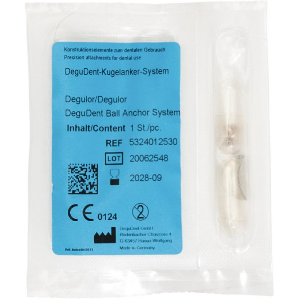 Der DeguDent Kugelanker ist ein resilientes Verbindungselement für partielle und hybride Prothesen, das in der Horizontalen starr ist, jedoch Vertikal- und Rotationsbewegungen zulässt. Die Lamellen der bereits ausgehärteten Matrizenhülse können zur Aktivierung nach innen gedrückt werden. Dies wird durch den auf der Matrize sitzenden PVC-Ring ermöglicht, der in der Kunststoffbasis mit einpolymerisiert wird und in der fertigen Prothese verbleibt. Stück Kugelanker