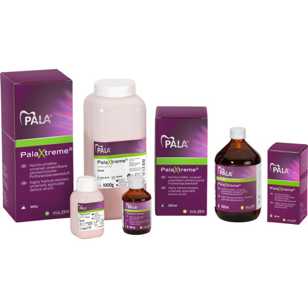 PalaXtreme® ist ein kaltpolymerisierender High-Impact Prothesenkunststoff, der Laboren eine große Flexibilität ermöglicht. Er ist genauso einfach in der Handhabung wie konventionelle Kaltpolymerisate. Das gilt sowohl für die Gieß - als auch die Injektionstechnik. Für Zahntechniker als auch Patienten ist dieses Material allergiefreundlicher – der Kunststoff ist somit stark und sanft zugleich. Packung 1 kg Pulver pink live