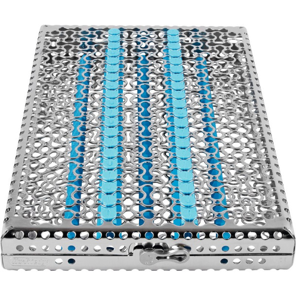 Die neuen IMS Kassetten im einzigartigen, revolutionärem neuen Lochmuster-Design besitzen ca. 30% mehr Öffnungen. Die innovativen Silikonschienen, die deutlich weniger Kontaktpunkte mit den Instrumenten haben, bieten beste Bedingungen bei Reinigung, Spülen und Wasserabfluss und erzeugen somit weniger Spülschatten. Ein ergonomischer, anwenderfreundlicher Verschluss zeigt, ob die Kassette offen oder geschlossen ist. Der neue Verschluss kann mit einer Hand geöffnet werden. Optimal für den Einsatz im RDG. Stück Kassette DIN für 6 Instrumente türkis