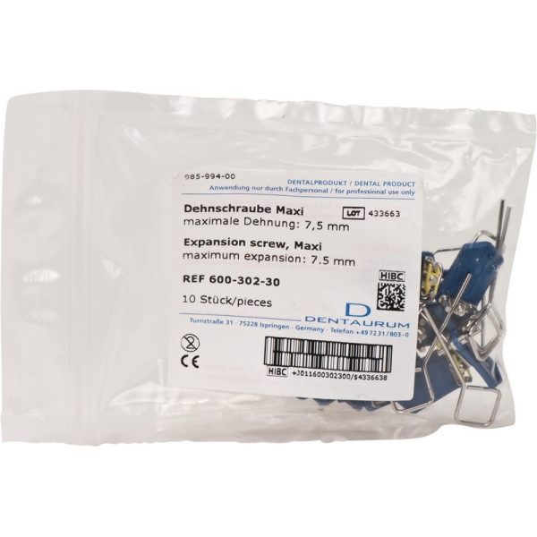 Mit zapfenförmigem Dehnschraubenhalter, skelettiert. Ausführung: extra kräftig, mit größerem Schraubenkörper. Dehnschraubenkörper mit Querbohrungen für die optimale Retention des Kunststoffes. Begrenzung des Dehnweges nach Erreichen der Maximaldehnung. Stück Schraube maxi, Drehrichtungspfeil Kunststoff leuchtgelb, Maximale Dehnung 7,5 mm