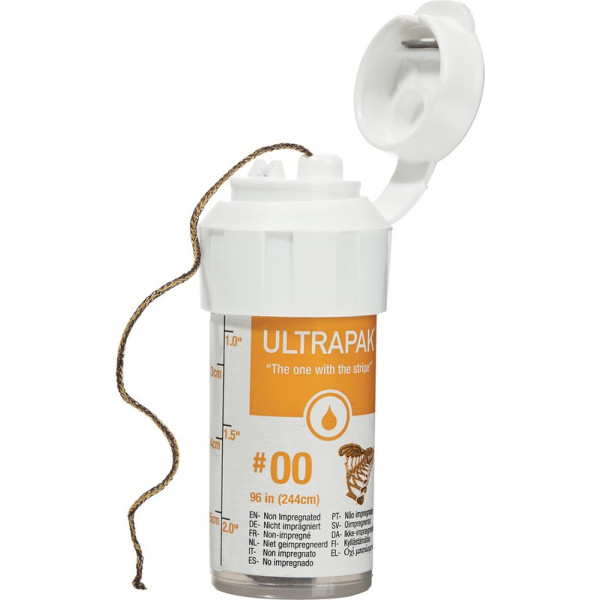 Der Ultrapak®-Retraktionsfaden setzt seit über 20 Jahren den Maßstab. Seine gestrickte Struktur sorgt für unübertroffene Geschmeidigkeit, Saugfähigkeit und effektives Abdrängen der Sulcus-Manschette vor der Abformung. Als Ultrapak® CleanCut wird die Handhabung zusätzlich erleichtert: Durch eine Schneide-Vorrichtung sowie eine Mess-Skala. Die CleanCut-Kappe trennt die Fadenstücke sauber ab, ohne sie auszufransen. Die an der Flaschen-Seite angebrachte Skala ermöglicht ein einfaches Ablängen. Flasche 244 cm Faden Nr. 00