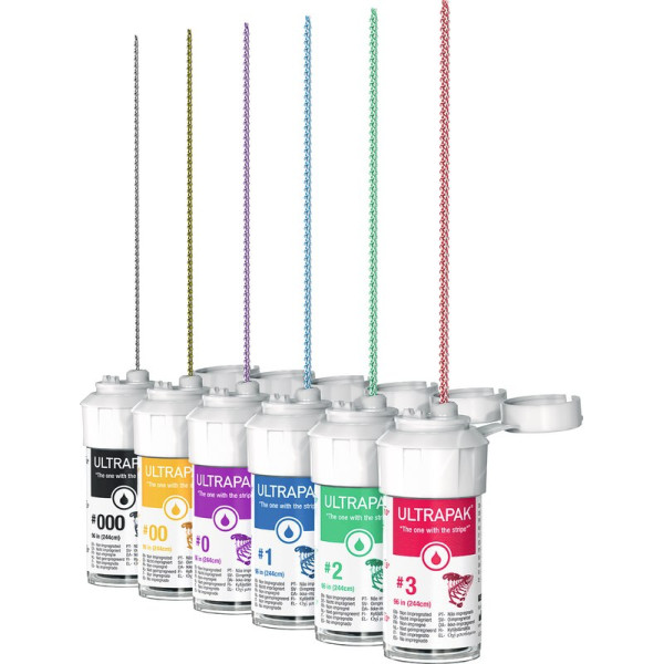 Der Ultrapak®-Retraktionsfaden setzt seit über 20 Jahren den Maßstab. Seine gestrickte Struktur sorgt für unübertroffene Geschmeidigkeit, Saugfähigkeit und effektives Abdrängen der Sulcus-Manschette vor der Abformung. Als Ultrapak® CleanCut wird die Handhabung zusätzlich erleichtert: Durch eine Schneide-Vorrichtung sowie eine Mess-Skala. Die CleanCut-Kappe trennt die Fadenstücke sauber ab, ohne sie auszufransen. Die an der Flaschen-Seite angebrachte Skala ermöglicht ein einfaches Ablängen. Flasche 244 cm Faden Nr. 000