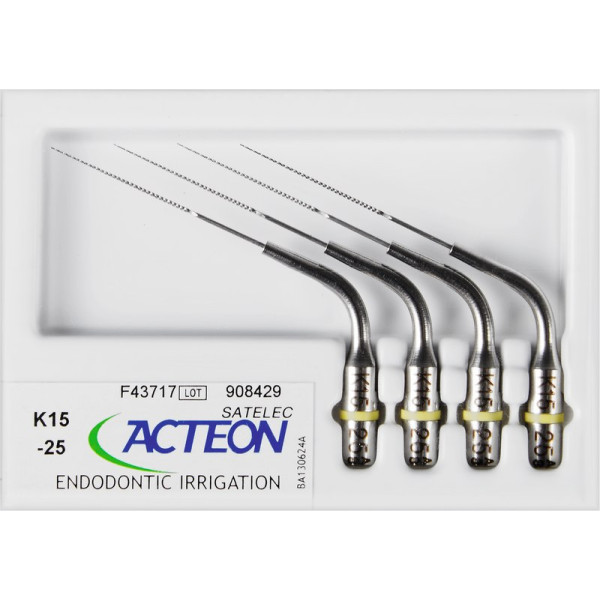 Die Sonofeilen werden mit einer Desinfektionslösung oder mit Salvizol EDTA während der einzelnen Behandlungsabschnitte bzw. mit Natriumhypochlorit zur Gewährleistung der Dekontamination und endgültigen Reinigung verwendet. Die Spülung erfolgt bis zur Beseitigung der Schmierschicht. Dabei ist höchste Sorgfalt anzuwenden.Feile K10 - Spülung zu BeginnFeile K15 - Spülung am EndeFeile K25 - Spülung am Ende in breiten KanälenFeile K30 - Spülung von breiten oder frischen Kanälen Blisterpackung 4 Feilen 25 mm K15